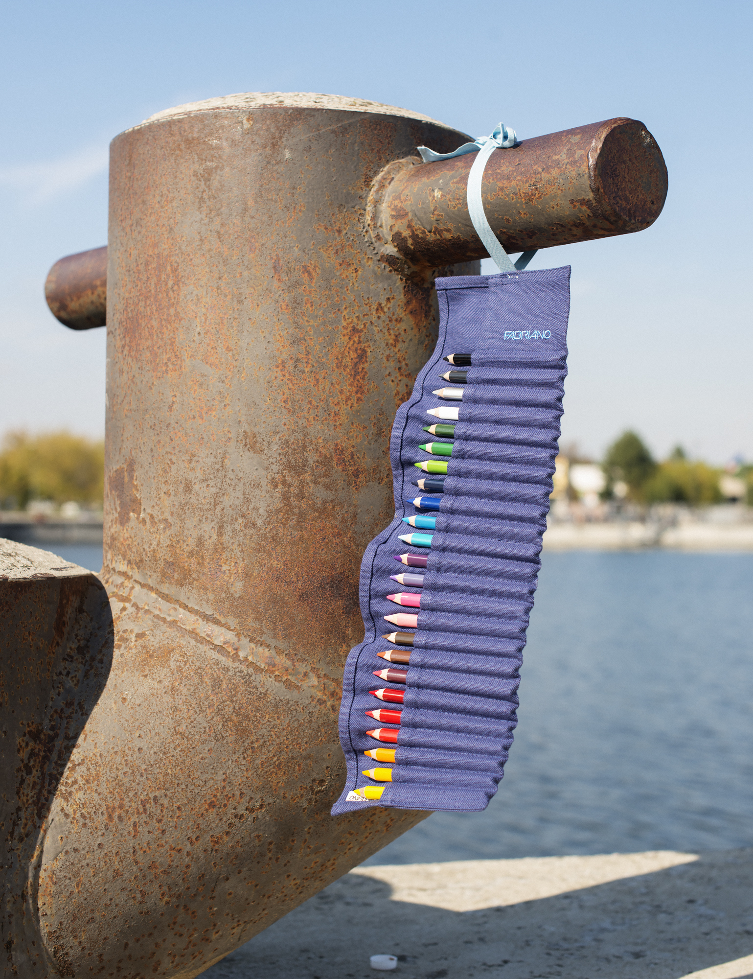 Réalisée dans un tissu de lin très résistant, cette trousse conçue comme une cartouchière se roule sur elle-même et se referme à l’aide d’un ruban. Une fois ouverte, elle déploie une gamme harmonieuse de vingt-quatre crayons de couleur à la forme ergonomique et à la pointe souple. Chaque crayon est rangé dans son étui, ce qui permet de repérer les teintes rapidement. Vidée de son contenu, la cartouchière peut accueillir des nouveaux crayons, des pinceaux, des petits outils de bricolage, ou du maquillage.