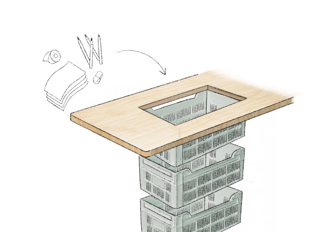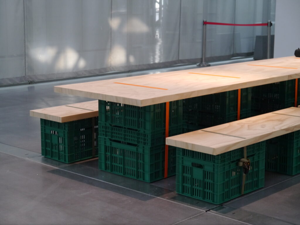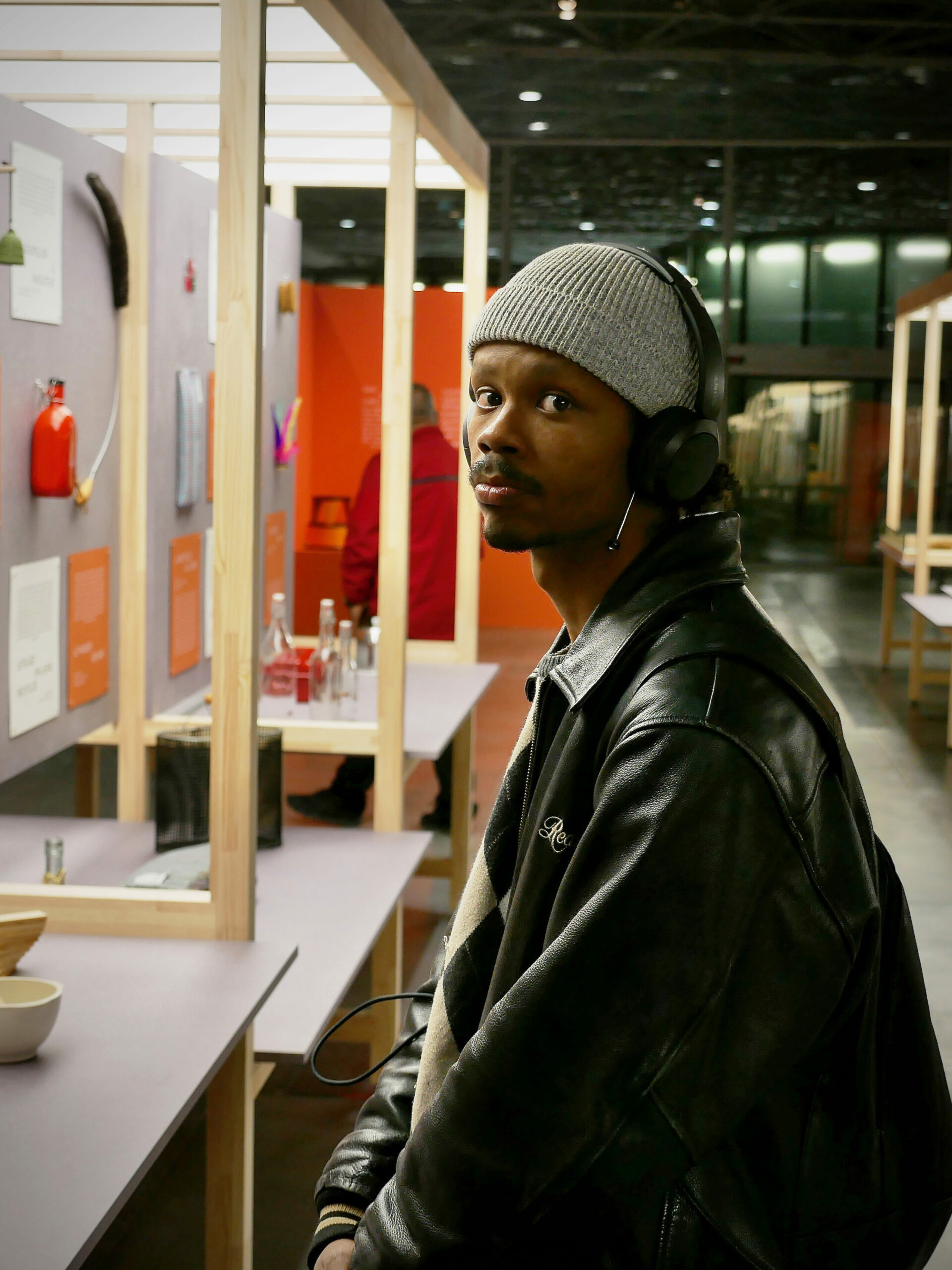 Inside the shop, the dream continues, large paper volumes float above wooden huts