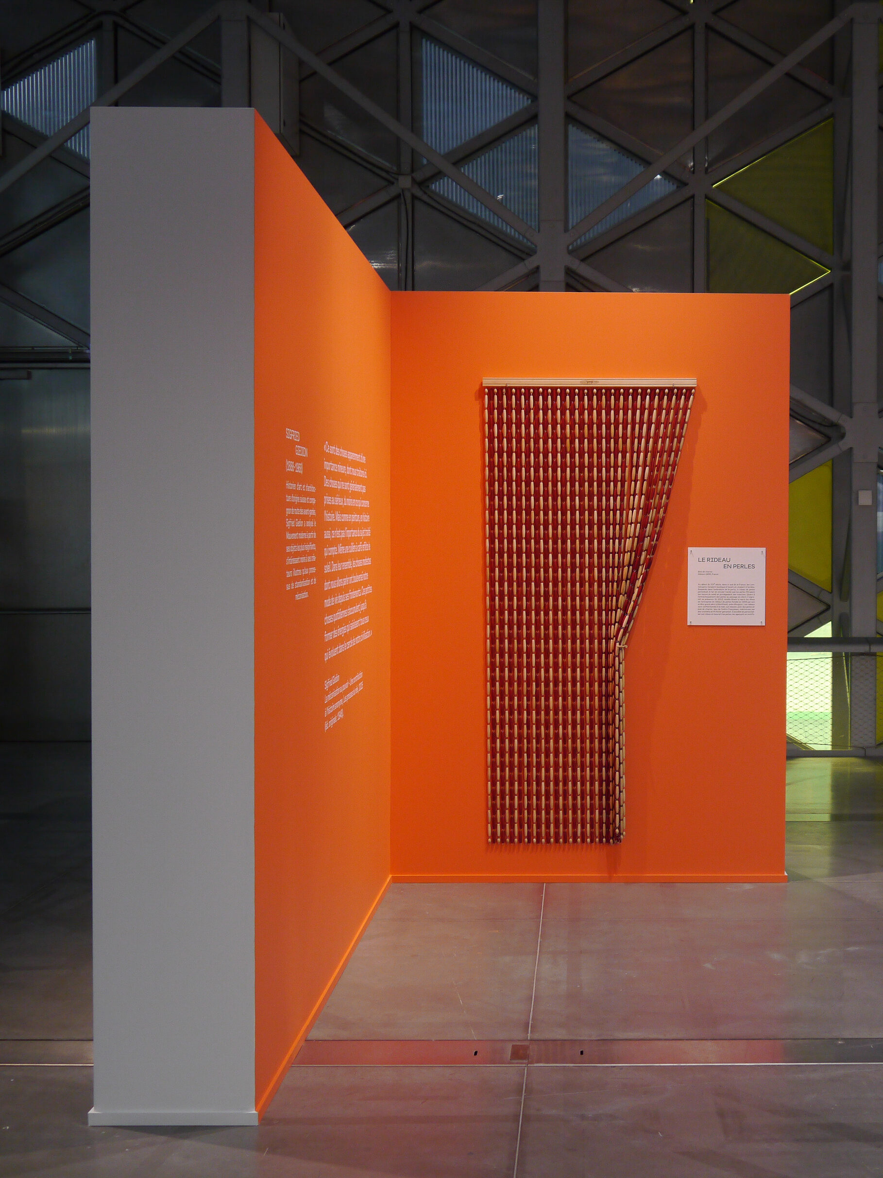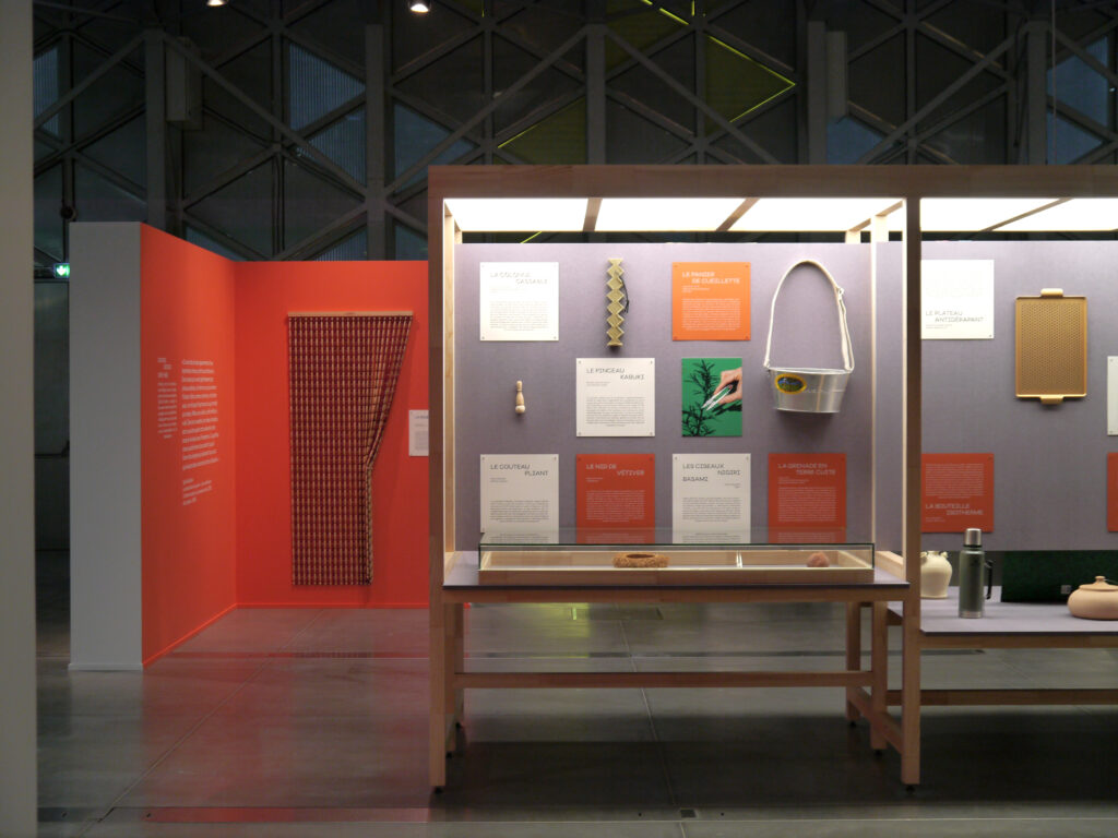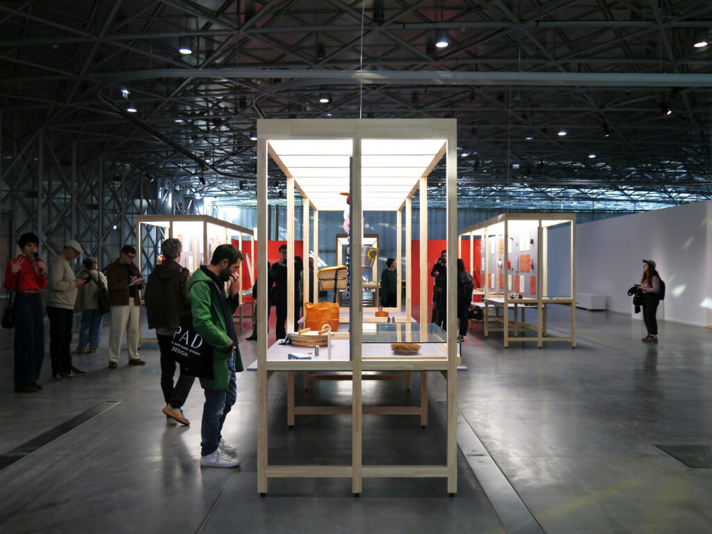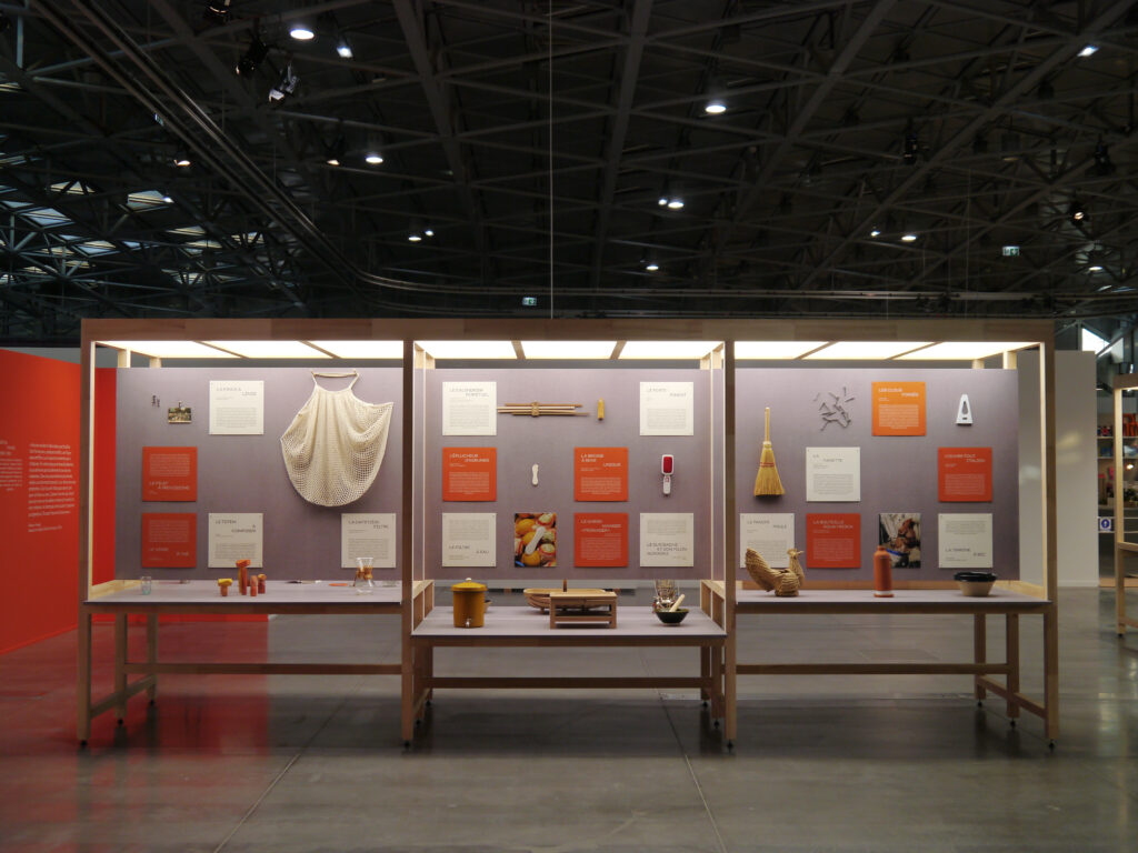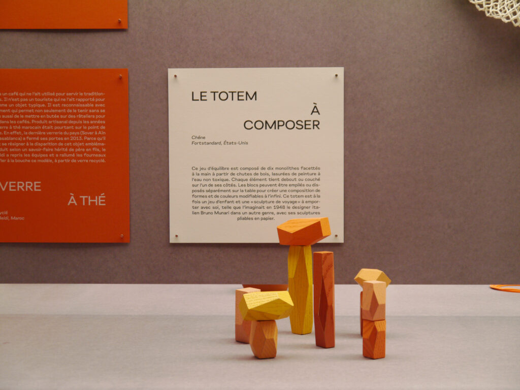 A l’interieur de la boutique, le rêve continue, des grands volumes en papier flottent au dessus de huttes en bois